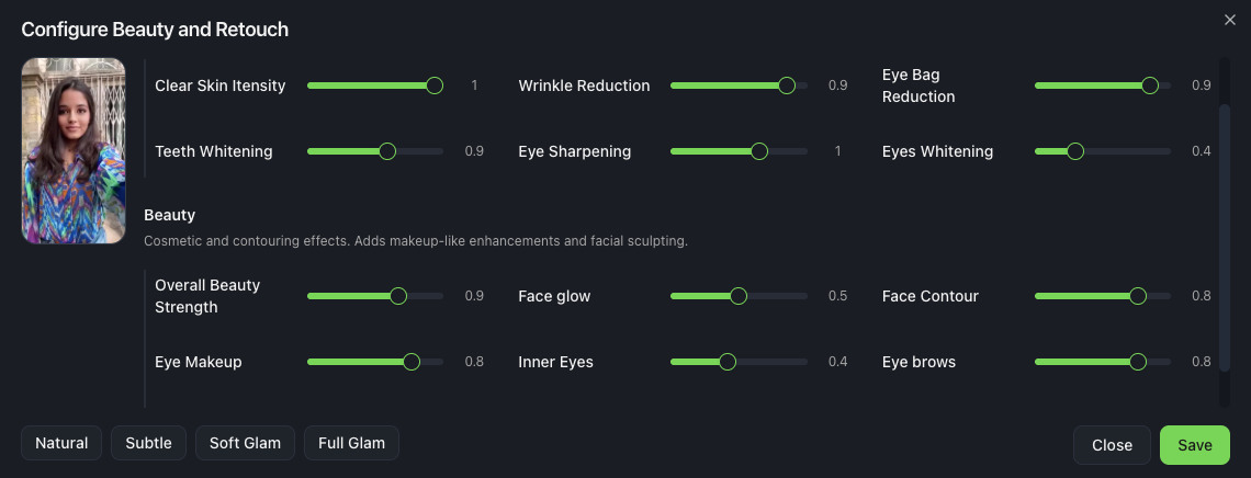 Each effect has its own slider, so you can dial things in exactly how you want — from barely-there “no-makeup makeup” to full glam. There are also 4 built-in presets if you want a quick starting point: